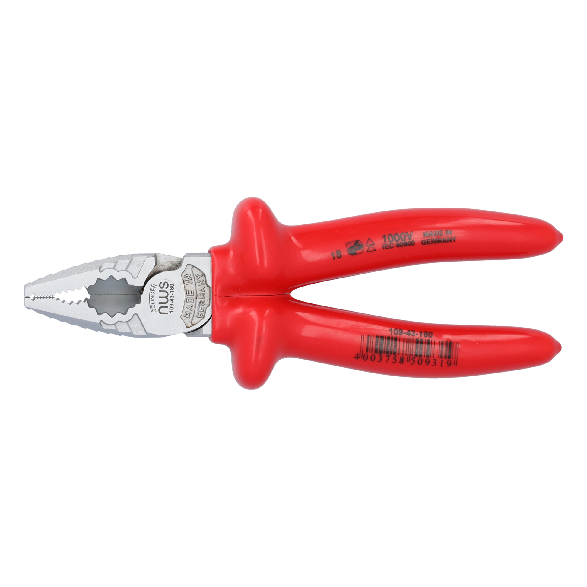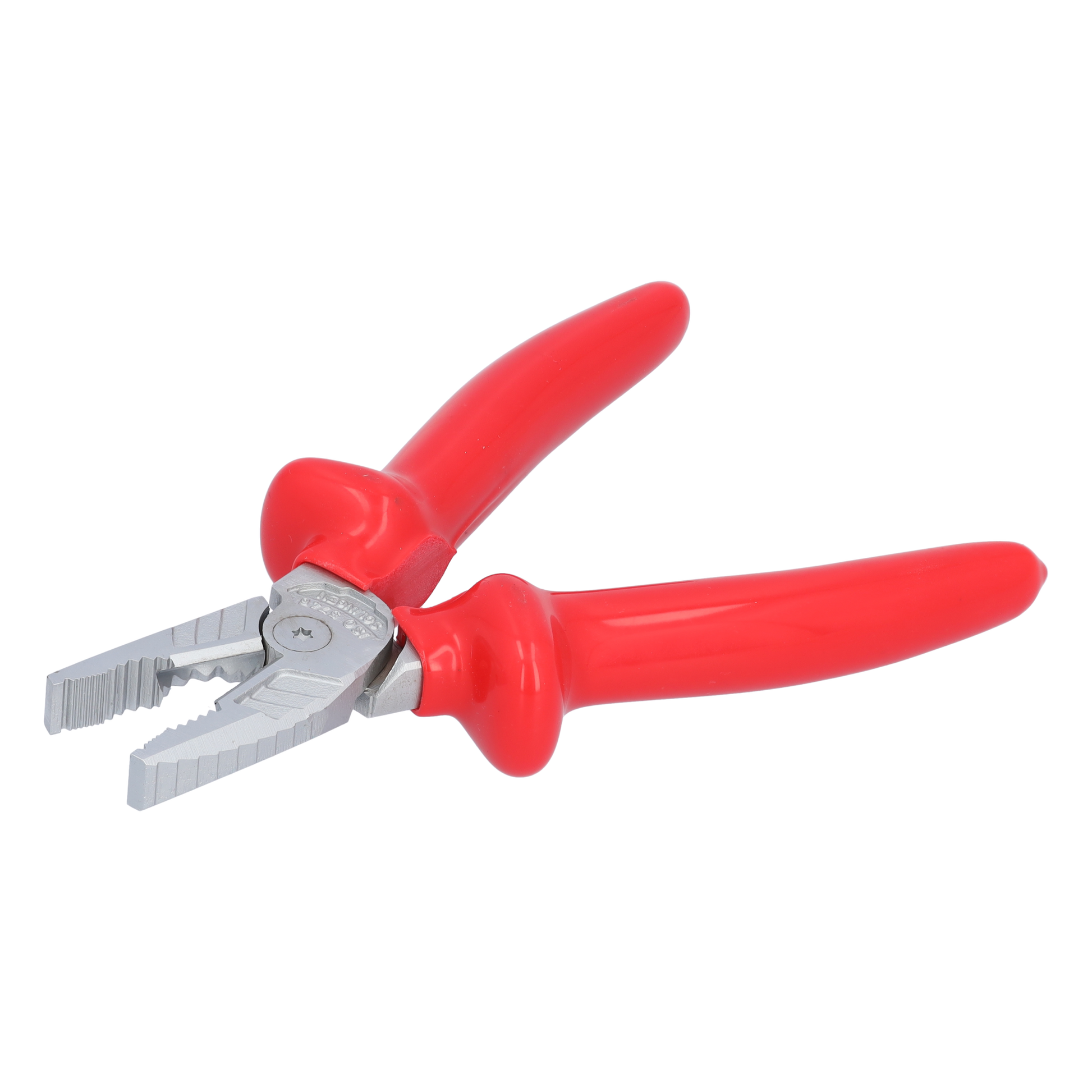 Kraft-Kombinationszange CombiMax 1000V Amerikanische Form Für Halte-, Greif-, Biege- und Schneidarbeiten Zum Schneiden von harten und weichen Drähten Schneiden zusätzlich induktiv gehärtet Mit Nagel- & Drahthalter Greifzonen für Flach- und Rundmaterial Asymmetrische Greifflächen für besseren Halt am Werkstück Integrierter Ringschlüssel Kraftgewerbe mit optimaler Hebelübersetzung für einfaches und ermüdungsarmes Arbeiten Griffe mit 1000V Mehrschichtisolierung nach DIN EN/IEC 60900 Aus Werkzeugstahl, geschmiedet, ölgehärtet Sicherheitsprüfverfahren nach IEC 60900 Sichtprüfung und Prüfung der Abmessung: Einzelkontrolle der Beschriftung des Grundwerkzeuges und der Isolierung. Wärme- und Kälte-Schlagprüfung: Bei Umgebungstemperatur (23°) und bei niedrigen Temperaturen (-25°) an drei verschiedenen, leicht verletzbaren Stellen. Spannungseinzelprüfung: Prüfung der elektrischen Isoliereigenschaft. Anlegen einer Spannung von 10 KV (Effektivwert) im Wasserbad über 3 min. und Messen des Ableitstromes. Druckprüfung - Durchschlagprüfung: Lagerung der Werkzeuge im Wärmeschrank (2 h bei 70°). Anlegen einer Spannung von 5 KV (Effektivwert) über 3 min. und Aufbringen einer Kraft von 20 N auf die Isolierung. Prüfung der Haftfähigkeit der Isolierung: Lagerung der Werkzeuge im Wärmeschrank (168 h bei 70°). Aufbringen einer Kraft von 500 N über 3 min. zwischen dem leitfähigen Teil und der Isolierung. Prüfung der Entflammbarkeit: Aufbringung einer Flamme über 10 sec.