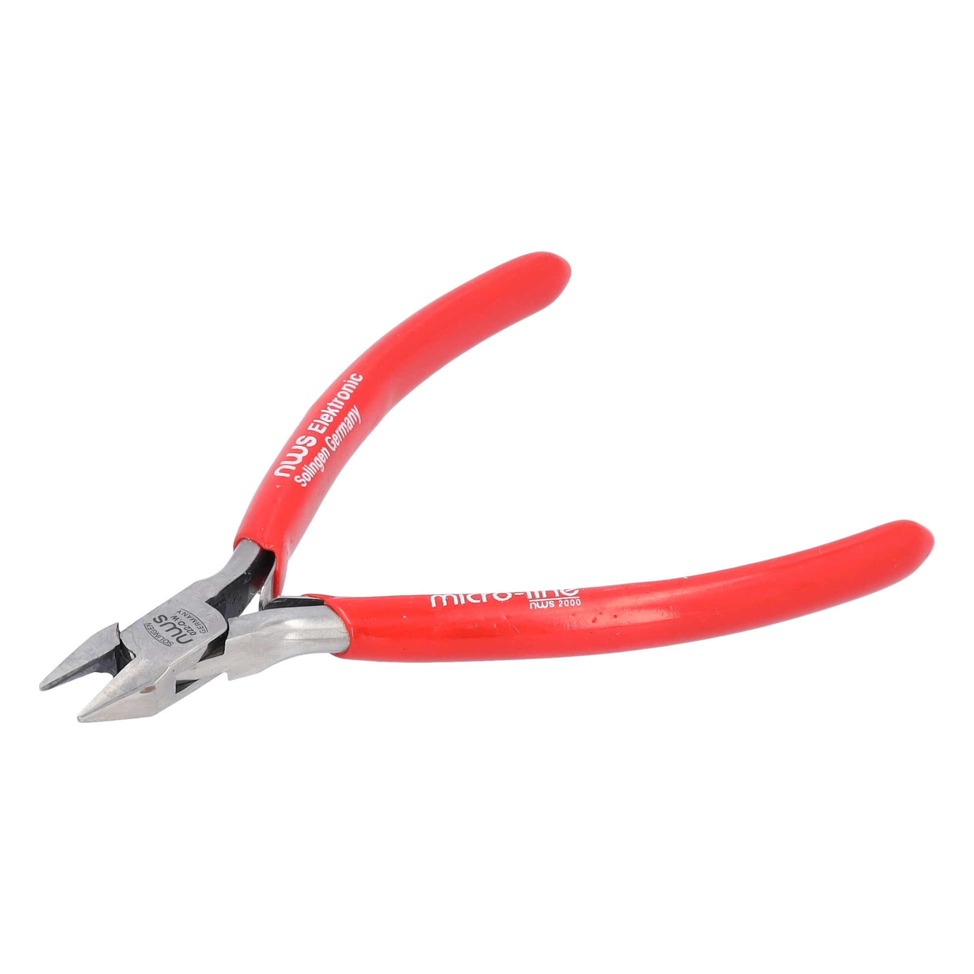 Präzisionsschneiden für feinste Drähte. Schneiden zusätzlich induktiv gehärtet. Schmaler, spitzer, abgeschrägter Kopf für sehr feine Arbeiten. Mit durchgestecktem Gelenk und Öffnungsfeder. Spielfreier Gang. Griffe mit Kunststoff überzogen. Aus Spezial-Werkzeugstahl, geschmiedet, ölgehärtet