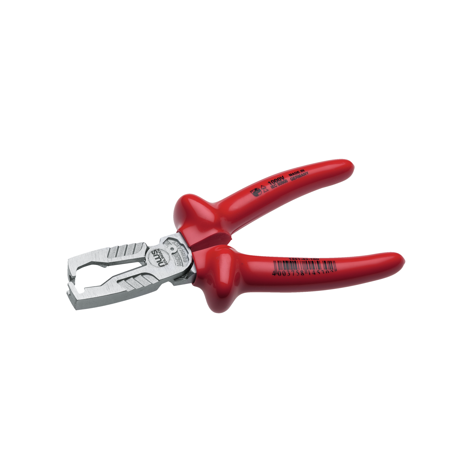 Multifunktionale Abisolierzange MultiCutter 1000V Zum Schneiden von harten und weichen Drähten Mit Kabelentmantelerfunktion für alle gängigen Kabel von Ø 8 mm bis Ø 13 mm Zum präzisen, schnellen und sicheren Abmanteln aller gängigen Rundkabel Schneiden zusätzlich induktiv gehärtet Präzisionsschneiden für feinste Drähte Mit V-förmiger Schneide für Drähte und Litzen bis max. Ø 5 mm bzw. 10 mm² Leiterquerschnitt Kraftgewerbe mit optimaler Hebelübersetzung für einfaches und ermüdungsarmes Arbeiten Griffe mit 1000V Mehrschichtisolierung nach DIN EN/IEC 60900 Aus Spezial-Werkzeugstahl, geschmiedet, ölgehärtet