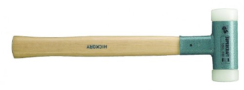 Mit auswechselbaren Schlagköpfen, aus hartem, weißen Nylon. Stiel aus Hickory, doppelt geschweift, natur lackiert. Rückschlagfrei, schont Sehnen und Gelenke