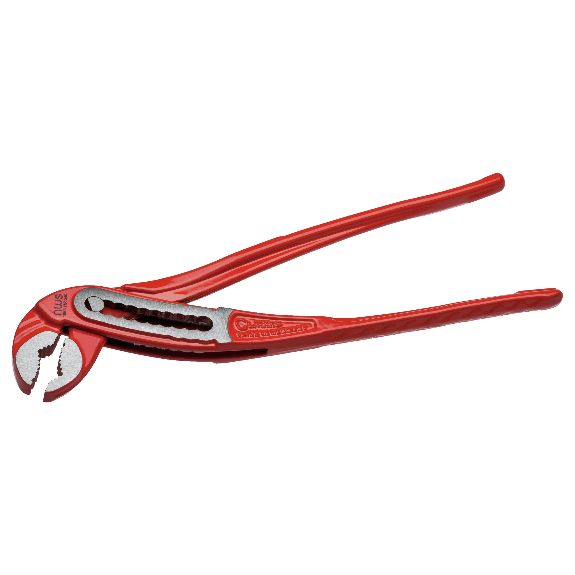 Wasserpumpenzange ClassicPlus Die unverwüstliche Wasserpumpenzange mit durchgestecktem Sicherheitsgelenk für höchste Beanspruchung Mit Nagel- & Drahthalter Greifbacken doppelt verzahnt Mit Aufnahme für optional erhältliche Kunststoffbacken, für die schonende Montage Optimale Maulgeometrie mit selbstklemmender Verzahnung für sicheres Greifen Greifkapazität 40% über DIN ISO durch bogenförmige Rasterverstellung Zähne zusätzlich induktiv gehärtet Klemmschutz für sicheres Arbeiten, verhindert Quetschverletzungen Durchgestecktes Gelenk mit breiten Führungsflächen Optimaler Drehpunkt, geringer Kraftaufwand Ergonomische Griffstellung und -form, für optimale Kraftübertragung Rot pulverbeschichtet Aus Spezial-Werkzeugstahl, geschmiedet, ölgehärtet
