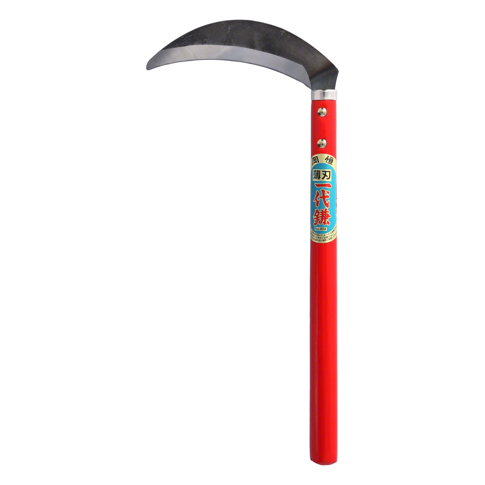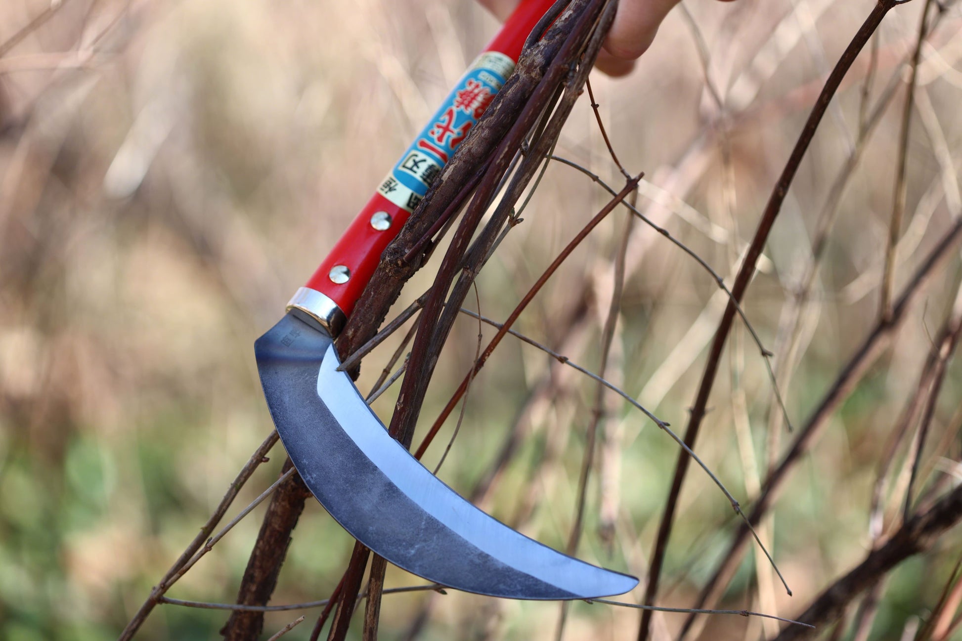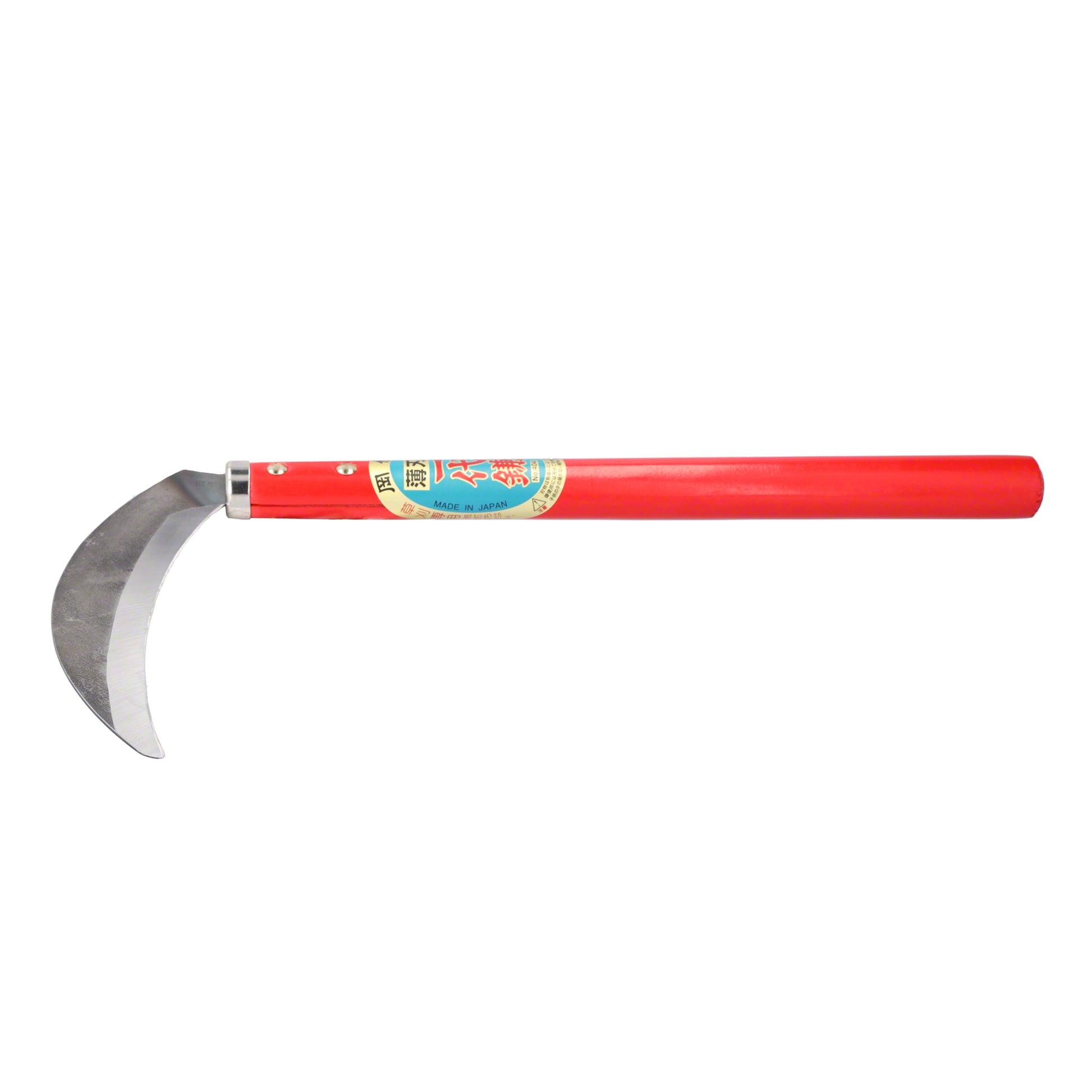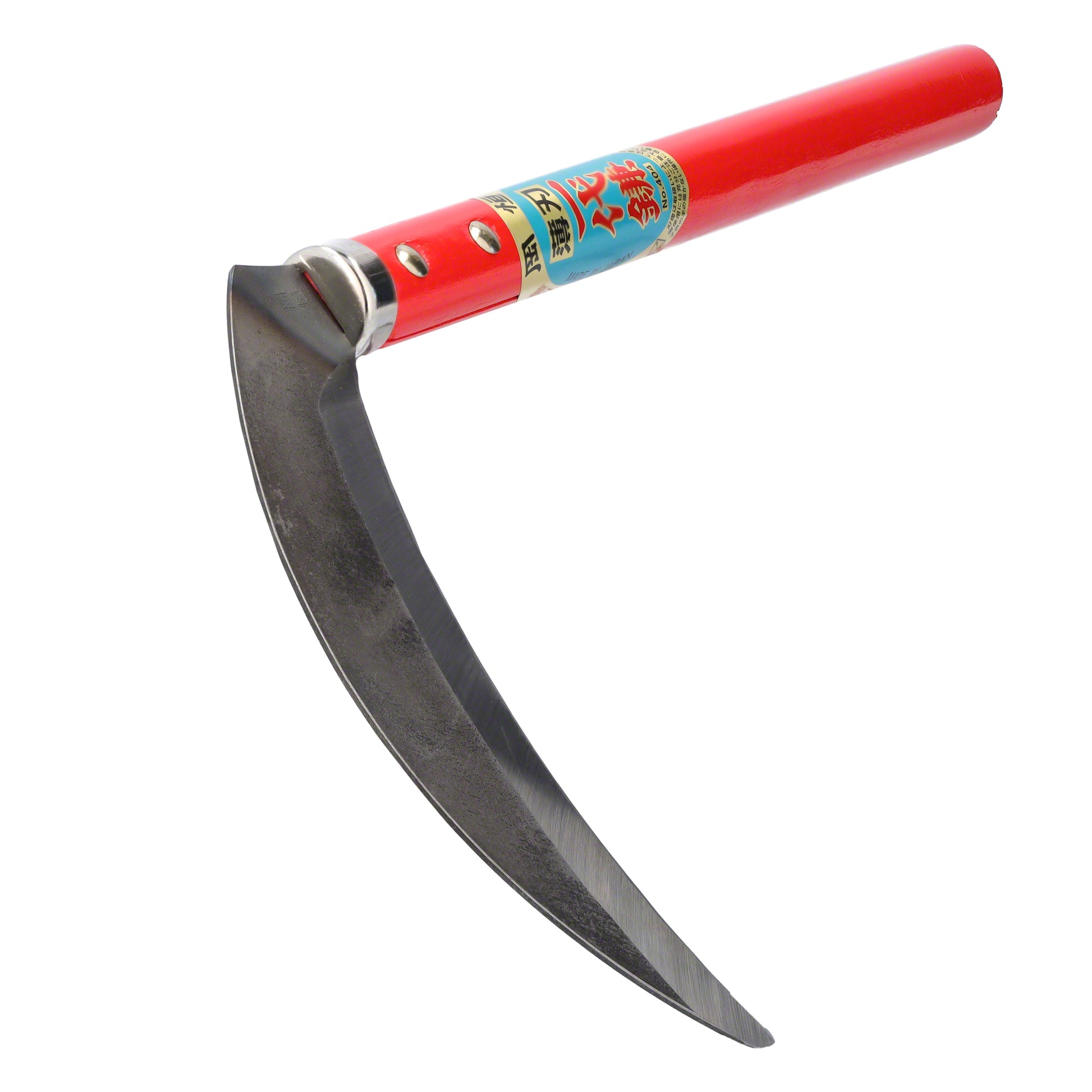 Die Sichel ist eines der ältesten Werkzeuge der Menschheit. Die Okatsune 404 ist ideal für Blumen, Gräser und Unkraut zu jäten. Die Sichel hat eine Rasiermesserscharfe gekrümmte Klinge mit einer Länge von 150 mm und eine Dicke von 1,4 mm. Der Holzgriff ist 320 mm lang und selbst in hohem Gras auffällig durch die rote Farbe
