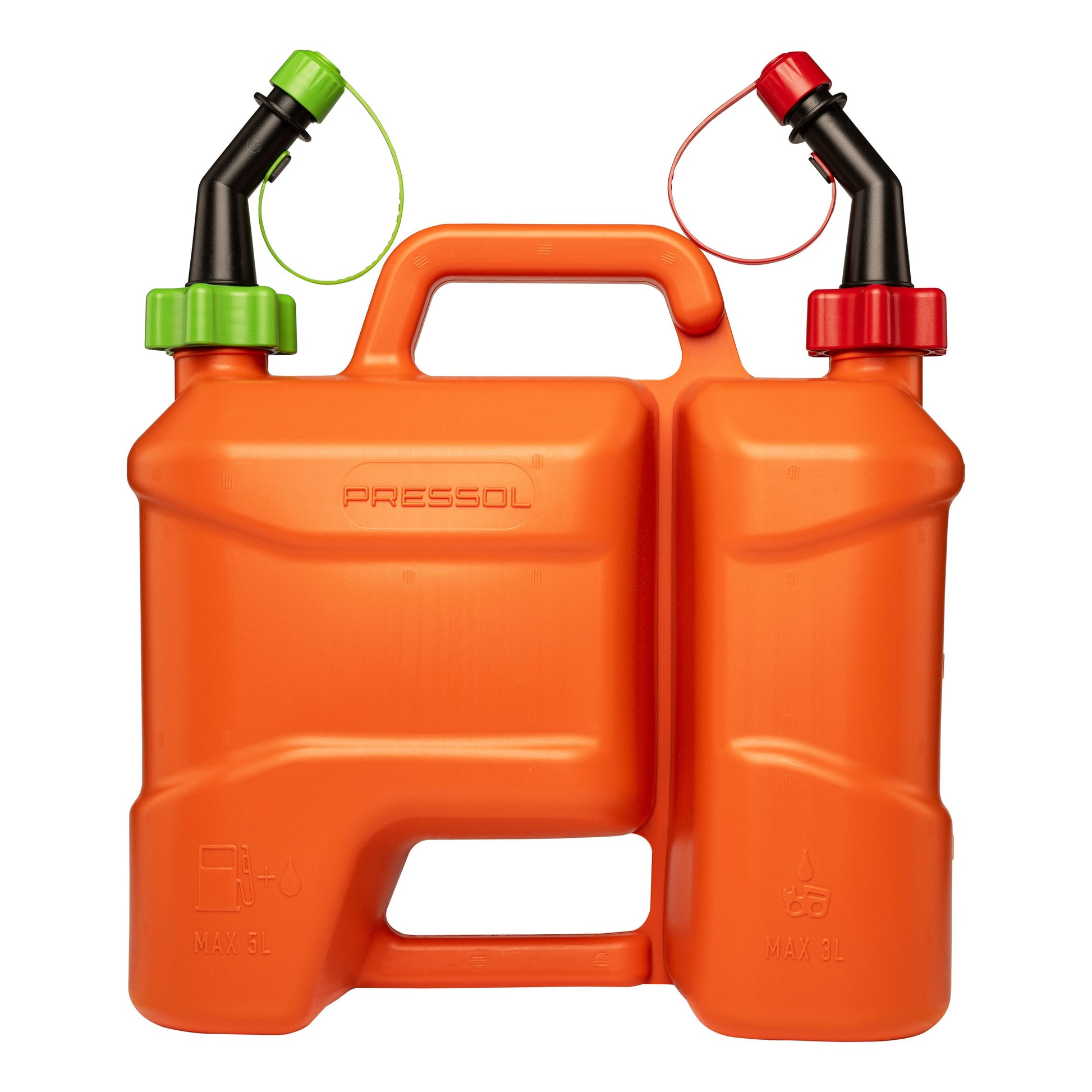 Pressol Kombi-Kraftstoffkanister-5l+3l, PE-Auslaufrohr | 5 Liter Kraftstoff | 3 Liter Kettenöl | HDPE (Polyethylen hoher Dichte) | Farbe Orange