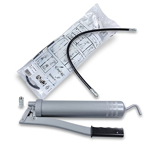 Die technischen Daten, die Sie angegeben haben, beschreiben eine manuelle Fettpresse mit folgenden wesentlichen Merkmalen: Anschlüsse: Füllnippel: M10 x 1 Fettpressenanschluss (druckseitig): M10 x 1 Füllvolumen: 500 cm³ Füllmöglichkeiten: 400-g-Fettkartusche (nach DIN 1284) oder loses Fett mittels Spachtel Pumpkolben: Durchmesser: 8 mm Betätigung: Mittels Handhebel Fördervolumen pro Hub: 1,2 cm³ (bei einer Fettdichte von 0,92 kg/dm³) Druckeigenschaften: Förderdruck bis zu 400 bar Berstdruck des Systems: 850 bar Berstdruck des Fettpressenkopfs: 1200 bar Abmessungen: 395 x 120 x 66 mm (LxBxH) Wandstärke des Fettpressenrohrs: 1,0 mm Oberfläche: Silber lackiert Spezifikationen und Zubehör: Füllnippel M 10 x 1 Panzerschlauch M 10 x 1, 8 x 500 mm Hydraulikmundstück M 10 x 1 Besondere Merkmale: Verarbeitet Fette bis NLGI 2 bei 20 °C
