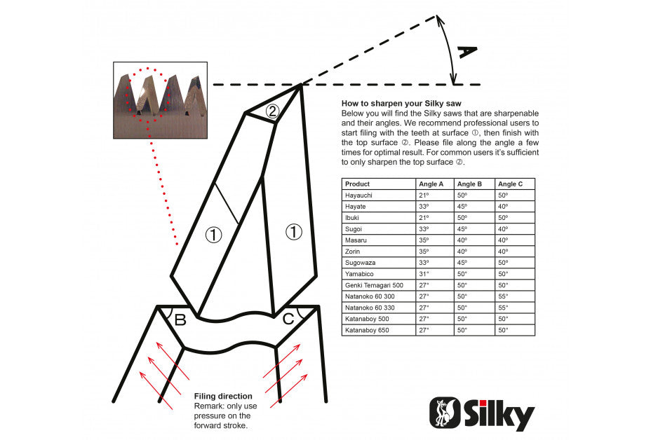 Silky Zähne bleiben lang scharf. Falls es notwendig ist, können die Zähne der folgenden Serien nachgefeilt werden: Hayauchi, Hayate, Natanoko60, Yamabico, Sugoi, Masaru, Zorin, Kamisorime, Ibuki, Temagari, Katanaboy, Todoku; Das vierte Bild zeigt die Feilinstruktionen jeder Serie.