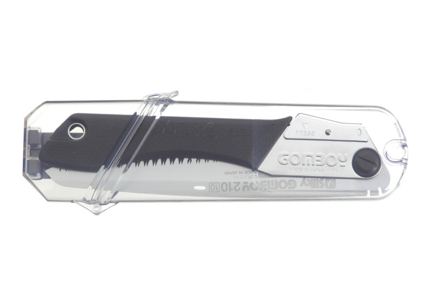Die Klappsäge Silky Gomboy 210 mit einer 10/30 mm medium verzahnten scharfen Klinge ist sowohl für trockenes als auch für frisches oder sogar nasses Holz jeder Art und Größe bestens geeignet. Die Gomboy 210 ist ein unverzichtbarer Teil Ihrer Ausrüstung bei Wanderungen, Lagerfeuer oder diversen Handwerksprojekten. Dank einer kompakten Form und Leichtgewicht kann diese Japansäge problemlos in einem Rucksack transportiert werden. Die Blattlänge der Handsäge beträgt 210 mm. Durch besondere von Silky patentierte Mirai-Me-Technologie ist das Schärfen der Zähne nicht nötig, dennoch kann das Sägeblatt leicht gegen ein Silky Gomboy Ersatzblatt ausgetauscht werden. Das verchromte Sägeblatt ist von Rost und Harz geschützt und bleibt somit robust und langlebig. Der ergonomische Gummi-Griff verringert Rutschgefahr und absorbiert Vibrationen. Das Loch im Griff ermöglicht die Befestigung von einem Seil oder Karabiner. Die Silky Gomboy 210 wird in einem transparenten Kunststoff-Holster geliefert. Für eine höhere Langlebigkeit halten Sie die Gomboy Säge immer sauber und trocken, vorzugsweise in einem Holster oder einer Hülle. Beachten Sie, dass durch die Verwendung aggressiver Mitteln der Gummigriff angegriffen werden kann. WARNUNG! Silky Handsägen sind extrem scharf, seien Sie vorsichtig bei der Verwendung und halten Sie die Säge von Kindern fern.