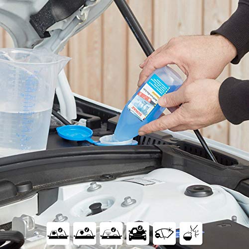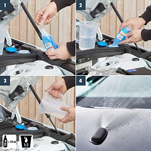 Scheibenwaschanlagen-Frostschutz mit Citrusduft für die Scheibenwaschanlage. Super Reinigungsleistung für noch schnellere Schlierenbeseitigung. Beseitigt die typischen Winterverschmutzungen und sorgt für klare Sicht. Verhindert das Einfrieren der Scheibenwaschanlage und Düsenvereisung. Absolut lack-, gummi- und kunststoffverträglich. Verursacht keine Spannungsrisse und Blindstellen an Scheinwerferstreuscheiben. Bestens geeignet für XENON-Scheinwerfer und Kunststoffstreuscheiben in Klarglasoptik. Produkteigenschaften Super-Reinigungsleistung mit wenigen Wischtakten und reduziertem Verbrauch. Auch für LED-, XENON-Scheinwerfer und Kunststoffstreuscheiben in Klarglasoptik bestens geeignet. Verursacht keine Spannungsrisse und Blindstellen an Scheinwerferstreuscheiben. Produktvorteile Schnellere Schlierenbeseitigung durch deutlich verbesserte Reinigungsleistung. Absolut kunststoff-, gummi- und lackverträglich. Fächerdüsentauglich. Verhindert Vereisung und Verstopfung der Düsen. Mit Anti-Kalk-Formel - mischbar mit Wasser aller Härtegrade. Mit Glycerin - hält Gummi geschmeidig. Anwendung Scheibenwaschbehälter vor dem Einfüllen leer sprühen. Antifrost Konzentrat öffnen und Reiniger in einfüllen. Nach dem Einfüllen die Scheibenwaschanlage betätigen, um die Leitungen durchzuspülen. Für eine optimale Reinigungsleistung eine Vermischung mit Sommer- oder anderen Winterscheibenreinigern vermeiden. Mischungsverhältnisse: Frostschutz bis - 30°C: Anteil AntiFrost: 2 Anteil Wasser: 1 Frostschutz bis - 20°C: Anteil AntiFrost: 1 Anteil Wasser: 1 Frostschutz bis - 10°C: Anteil AntiFrost: 1 Anteil Wasser: 2