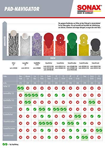 Mittelharter, offenporiger Schwamm mit sehr gleichmäßigen Zellen zum maschinellen Polieren von Lacken durch Exzentermaschinen mit 150mm Stützteller. Hohe Stabilität und Temperaturfestigkeit durch die gute Durchlüftung und spezielle Kühlung des Zentrums. Das hohe Speichervermögen des Schwammes verhindert das Verspritzen der Politur. Schneller Scheibenwechsel durch Klettverschluss. Durchmesser 165mm. Ideal für die Verarbeitung von SONAX PROFILINE EX 04-06 (0242...). Anwendung ? Schwamm gut zentriert auf den Klettstützteller der Poliermaschine aufsetzen ? Während des Gebrauches regelmäßig mit Druckluft ausblasen. Diese Zwischenreinigung kühlt zusätzlich, verbessert das Polierergebnis und erhöht die Lebensdauer des Schwammes. ? Zum Reinigen am Arbeitsende mit SONAX PROFILINE PREPARE (0237...) satt einsprühen. Anschließend sorgfältig mit warmem Wasser und SONAX MULTISTAR (0627...) auswaschen und trocknen lassen.