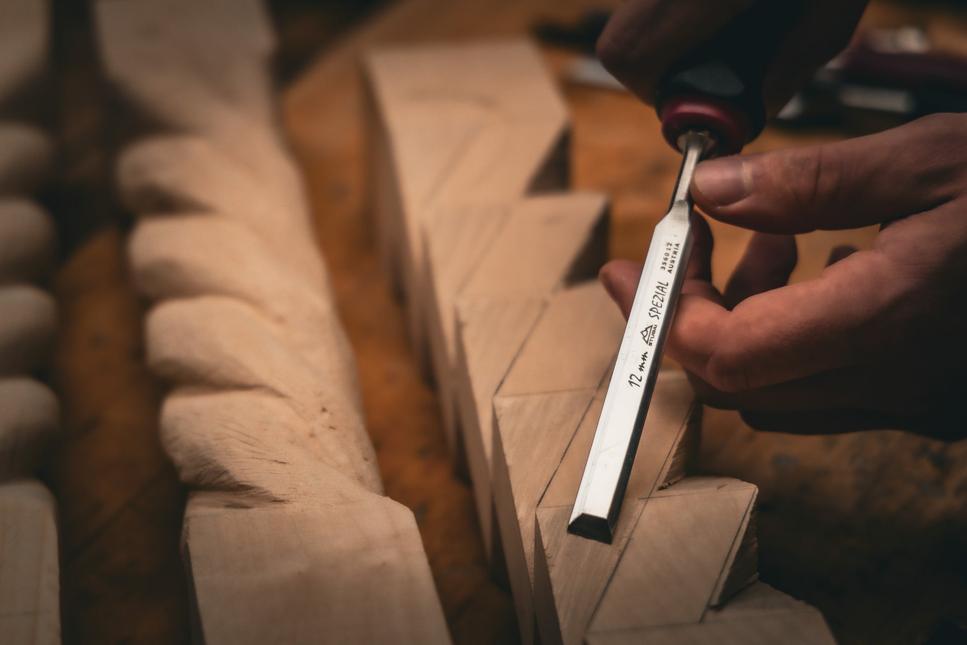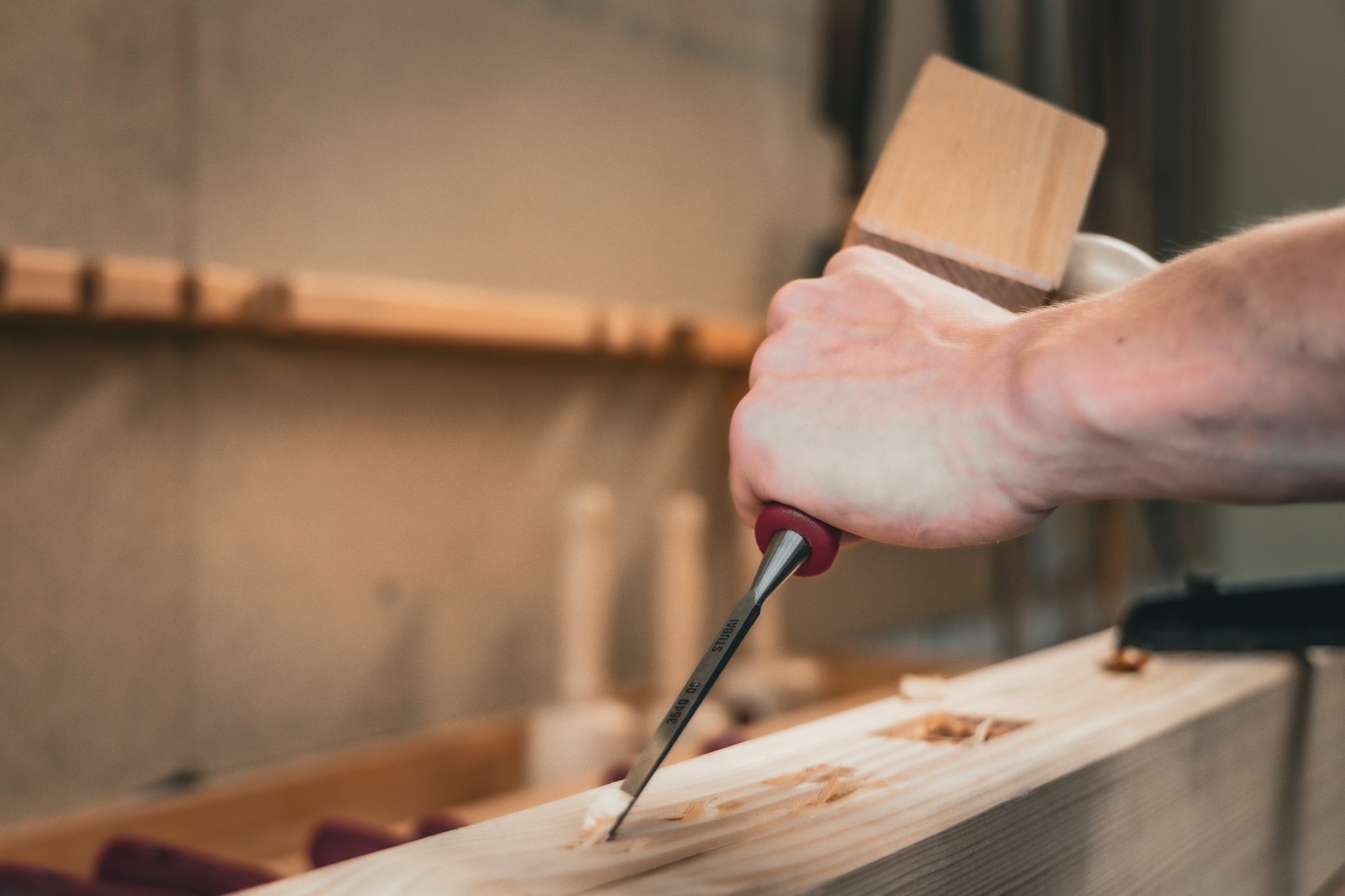 Das STUBAI Holz-Stemmeisen mit dem rot-schwarzem Plastikheft ist ein robustes und hochwertiges Werkzeug zur Holzbearbeitung, das speziell für den professionellen Einsatz entwickelt wurde. Der ergonomische und hochschlagfeste Griff besteht aus einer hochschlagfesten Hartkomponente und einem rutschfesten Gummiring. Die asymmetrisch ausgeführte Gummikomponente sorgt dabei für einen festen Halt während des Einsatzes. Die Baulänge des Griffes wurde ungewöhnlich lang gestaltet, um präzise und ermüdungsfreie Arbeit zu gewährleisten. Mit dem praktischen Aufhängeloch ist das Stemmeisen zudem an der Werkzeugwand oder im Werkzeugschrank einfach zu lagern. Ein Rollstopp und zwei Flächen verhindern, dass das Werkzeug unbeabsichtigt vom Tisch abrollt. Dank des ergonomisch geformten Griffs und der abrutschsicheren Oberfläche liegt das Stemmeisen sicher und bequem in der Hand und ermöglicht eine präzise Handhabung. Der Stechbeitel verfügt über eine hochwertige Klinge, die aus einem hochfesten, legierten Werkzeugstahl besteht, wobei 2/3 der gesamten Klingenlänge auf 62 Rockwell gehärtet sind. Die Klinge ist hochglanzpoliert und mit einer Artikelnummer markiert. Der Korrosionsschutz erfolgt durch einen umweltfreundlichen, wasserlöslichen Einbrennlack. Für eine optimale Schärfe des Holzmeißel gilt folgende Schärfanweisung: Um eine lange Lebensdauer zu gewährleisten, sollte das Stemmeisen 25° nass geschliffen und die Anlasstemperatur von 200° C (= hellgelb) keinesfalls überschritten werden, da die Härte an der Schneide sonst abnimmt und die Langlebigkeit verloren geht. Das STUBAI Stemmeisen ist somit ein hochwertiges Schreinerwerkzeug, das durch seine Qualität und Verarbeitung überzeugt. Der Holzmeißel eignet sich ideal für den professionellen Einsatz in der Holzbearbeitung und ist ein unverzichtbares Werkzeug für anspruchsvolle Handwerker, Schreiner, Tischler und Hobbyhandwerker, die hochwertige Holzwerkzeuge für ihre Projekte benötigen.