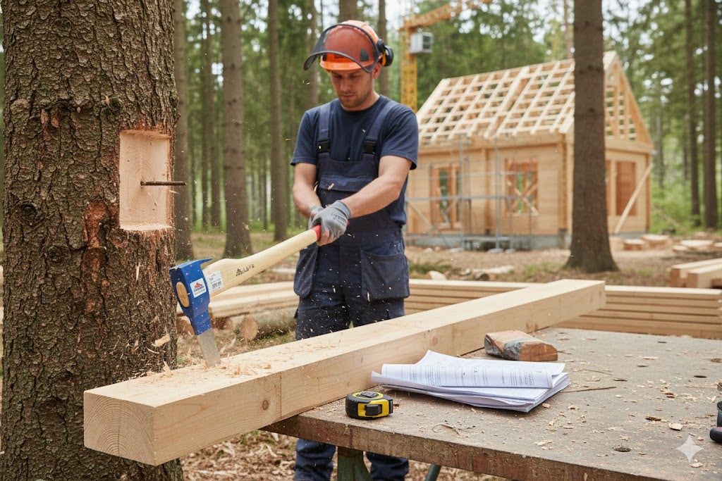 MIT ESCHENSTIEL 800 MM – Langer Stiel für Reichweite und kontrollierte Schläge; liegt sicher in der Hand und unterstützt präzises Führen beim Zimmern und Anpassen.