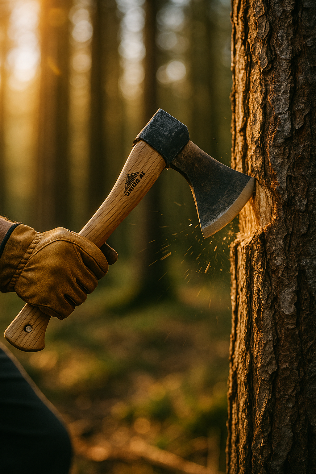 Die handgeschmiedete Klinge besteht aus robustem Kohlenstoffstahl mit einer Härte von 52–55 HRC. Sie ist ab Werk extrascharf geschliffen und bietet eine präzise, langlebige Schneidleistung – ob beim Holzspalten, Entasten oder für feine Arbeiten am Lagerplatz.