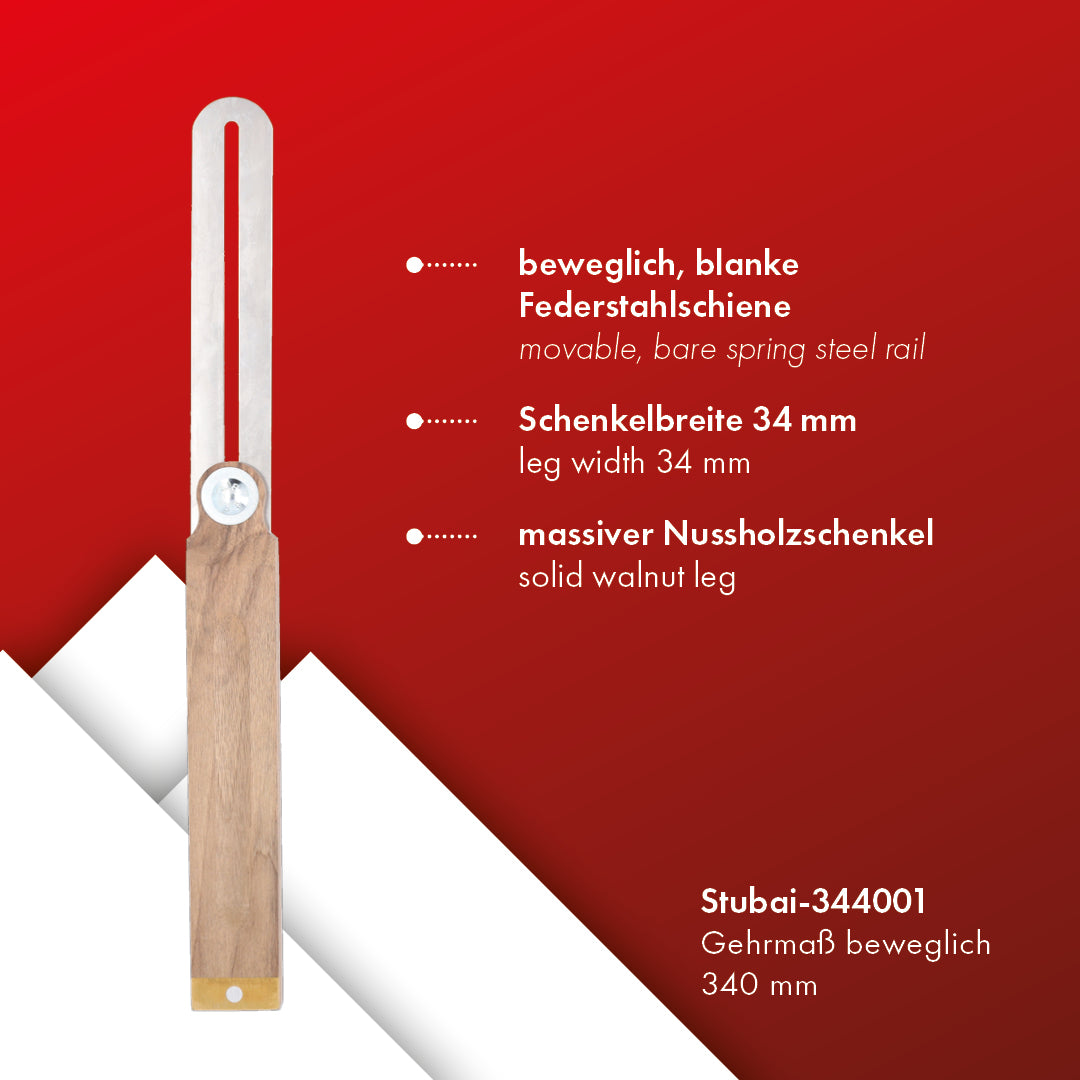 STUBAI Gehrmaß 330 mm beweglich | hochwertige Federstahlschiene mit Nussholzschenkel | Profi Winkelmesser für präzise Messungen und Markierungen