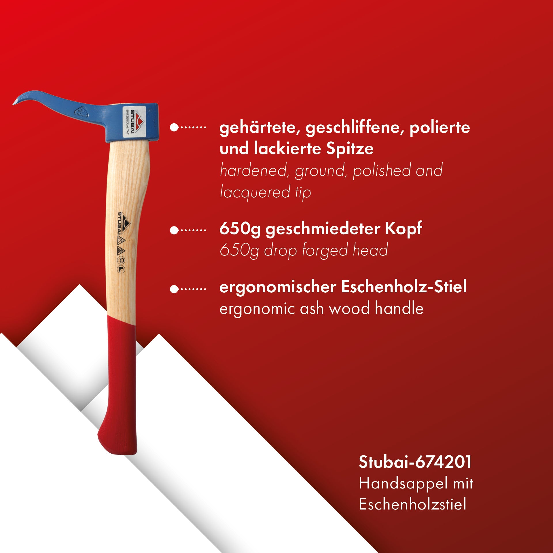 STUBAI Handsappel mit Eschenholzstiel | 450 mm, 650 g Kopfgewicht | Handsappel Gesenkgeschmiedet | zum Aufnehmen und Transportieren von Holzstücken und Baumstämmen