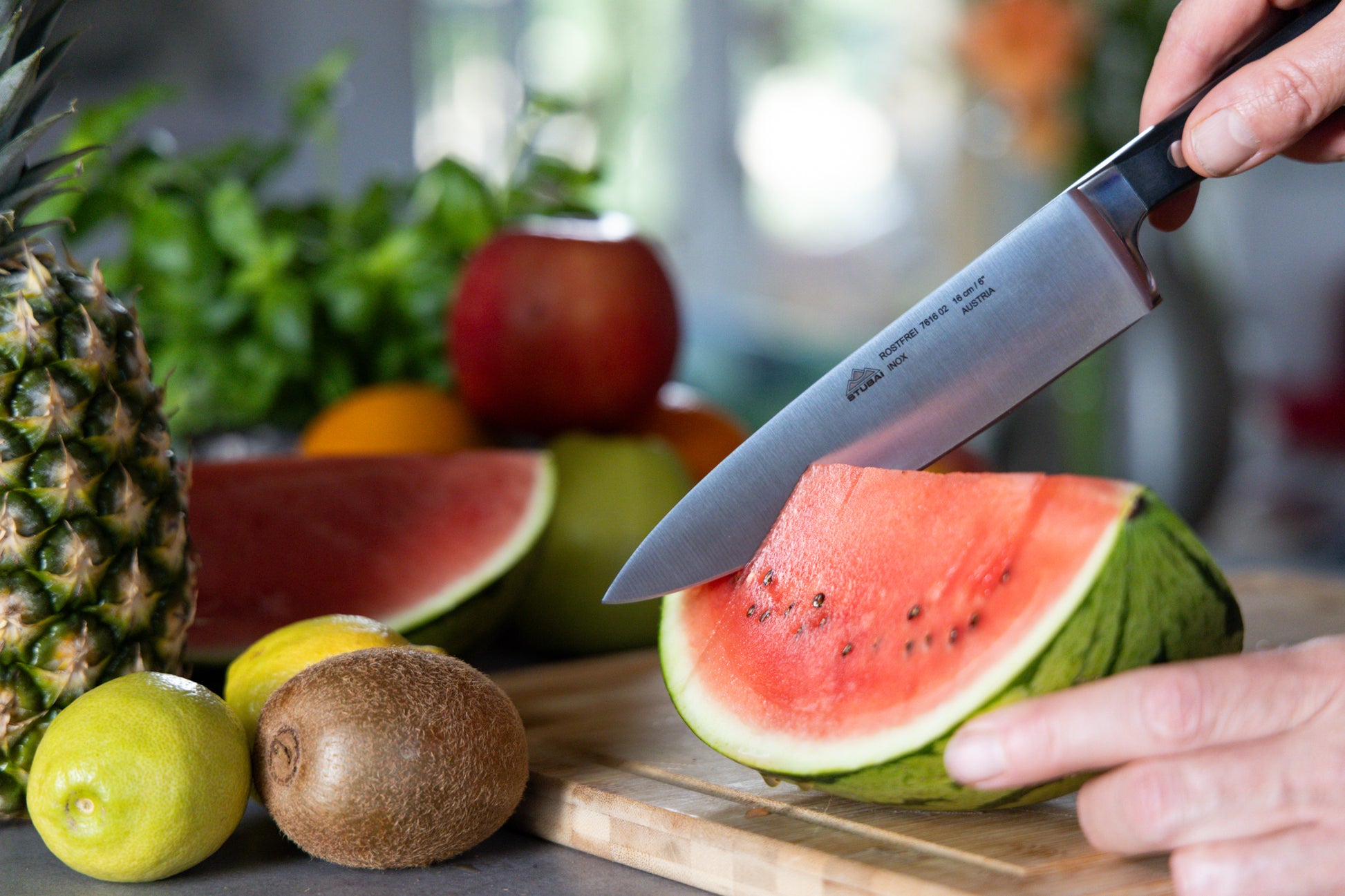 Das Kochmesser von STUBAI ist ein vielseitiges Werkzeug für Ihre Küche! Mit einer hochwertigen Klinge aus rostfreiem Chrom-Molybdän-Edelstahl, die aus einem einzigen Stück geschmiedet wird, bietet dieses scharfe Allzweckmesser eine herausragende Schneidleistung. Die Klinge ist besonders schneidhaltig dank einer Spezialhärtung, balligem Schliff und präzisem Handabzug. Zudem ist sie fein ausgeschliffen und fein poliert, um müheloses Schneiden zu gewährleisten. Der spülmaschinenfeste Griff des Kochmessers besteht aus hochwertigem Polypropylen und ist leicht zu reinigen. Mit seiner handlichen und ergonomischen Form liegt der Griff bequem in der Hand und sorgt für eine optimale Kontrolle beim Schneiden. Er ist fugendicht verschweißt und speziell vernietet, um höchsten Lebensmittel- und Hygienestandards zu entsprechen. Mit diesem Küchenmesser haben Sie ein zuverlässiges Werkzeug zur Hand, das in jeder Küche unentbehrlich ist. Egal, ob Sie Gemüse schneiden, Fleisch zubereiten oder andere Lebensmittel bearbeiten möchten, dieses Messer bietet Ihnen die Präzision und Qualität, die Sie benötigen. Überzeugen Sie sich selbst von der hervorragenden Verarbeitung und Funktionalität dieses Kochmessers und machen Sie Ihre Kocherlebnisse zu einem Genuss! Aufgrund der strengen internationalen und EU-Auflagen für Sicherheit und Hygiene hat STUBAI farbige Messergriffe entwickelt. Die verschiedenen Griff-Farben weisen auf den jeweiligen Einsatzbereich hin: Gelb - Geflügel; Grün - Gemüse; Blau - Fisch; Rot Fleisch.