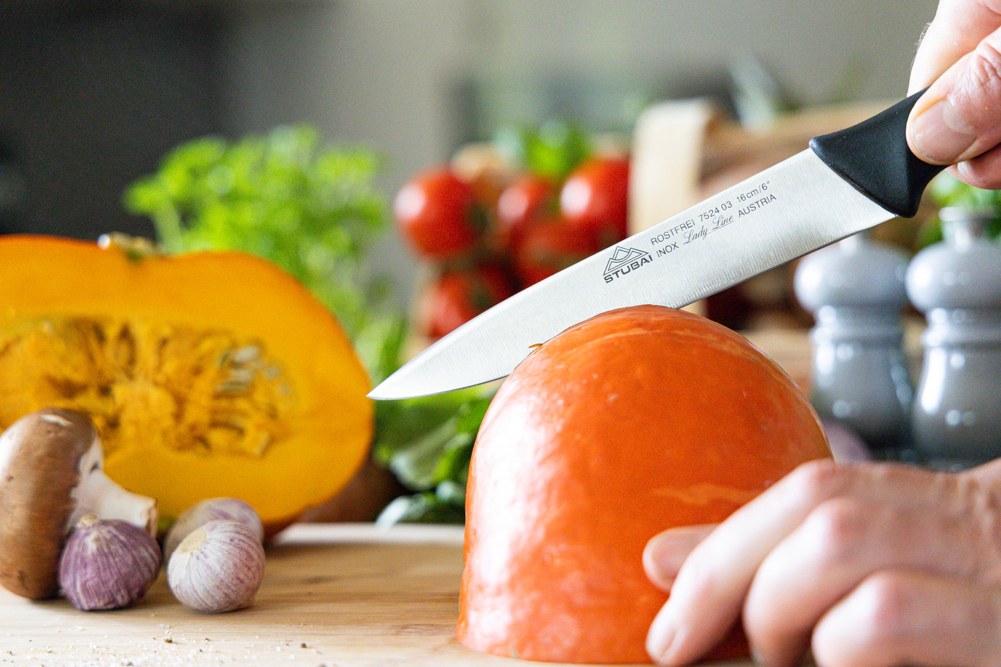 Das Küchenmesser ArtNr. 752403 der Serie Lady Line" von STUBAI ist ein vielseitiges Werkzeug für Ihre Küche! Mit einer hochwertigen Klinge aus rostfreiem Chrom-Molybdän-Edelstahl, die aus einem einzigen Stück geschmiedet wird, bietet dieses scharfe Allzweckmesser eine herausragende Schneidleistung. Die Klinge ist besonders schneidhaltig dank einer Spezialhärtung, balligem Schliff und präzisem Handabzug. Zudem ist sie fein ausgeschliffen und fein poliert, um müheloses Schneiden zu gewährleisten. Der spülmaschinenfeste Griff des Küchenmessers besteht aus hochwertigem, glasfaserverstärktem Polypropylen und ist leicht zu reinigen. Mit seiner handlichen und ergonomischen Form liegt der Griff bequem in der Hand und sorgt für eine optimale Kontrolle beim Schneiden. Er ist fugendicht verschweißt und speziell vernietet, um höchsten Lebensmittel- und Hygienestandards zu entsprechen. Mit diesem Küchenmesser der Serie Lady Line" haben Sie ein zuverlässiges Werkzeug zur Hand, das in jeder Küche unentbehrlich ist. Egal, ob Sie Gemüse schneiden, Fleisch zubereiten oder andere Lebensmittel bearbeiten möchten, dieses Messer bietet Ihnen die Präzision und Qualität, die Sie benötigen. Überzeugen Sie sich selbst von der hervorragenden Verarbeitung und Funktionalität dieses Küchenmessers und machen Sie Ihre Kocherlebnisse zu einem Genuss!