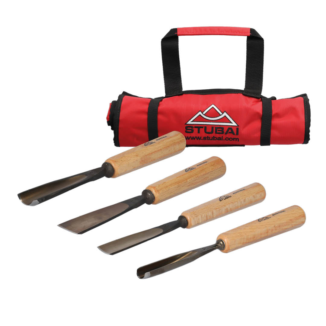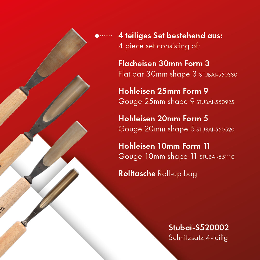 Die STUBAI Kerbschnitzmesser sind vielseitig einsetzbare Werkzeuge, die für verschiedene Holzschnitzereien verwendet werden können. Sie eignen sich besonders gut für Holzarten wie Linde, Ahorn und Zirbel aber auch für Eichen- und Olivenholz. Die Schnitzwerkzeuge überzeugen durch ihre besonders robuste Fertigung, welche Langlebigkeit und beständige Schneidleistung gewährleisten. Die Holzschnitzmesser können zum Anfertigen von Skulpturen, Krippenfiguren, Kreuze, Madonnen, Sakrales und beim figürlichem Schnitzen eingesetzt werden. Die Messer sind einfach zu handhaben und führen bei Hobbyschnitzern und Schnitzanfängern zu einem schnellen Lernerfolg. Auch Profi-Schnitzer schätzen die Qualität der Holzschnitzmesser. Die Klingen bestehen aus speziellem Kohlenstoffstahl, der in der modernen, werkseigenen Härterei auf 58-60 HRC wärmebehandelt wird. Dadurch sind maximale Stabilität und Haltbarkeit für ein präzises und zuverlässiges Schnitzen garantiert. Die Messer werden gebrauchsfertig auf 20 bis 30 Grad vorgeschliffen und können je nach Bedarf nachgeschärft werden. Mit den perfekt abgestimmten Formen und Größen ermöglicht es freihändiges Schnitzen aber auch die Holzbearbeitung im Schraubstock oder auf der Werkbank. Durch den langen, handlichen Griff der Schnitzmesser aus lackiertem Buchenholz wird ein langes, ermüdungsfreies Arbeiten möglich. Ob Sie als Hobby-Schnitzer Ihre ersten Werke kreieren oder als Profi wahre Meisterwerke erschaffen, die STUBAI Holzschnitzmesser sind unverzichtbare Werkzeuge für jeden Holzliebhaber. Verlassen Sie sich auf die Qualität der Messer und lassen Sie Ihrer Kreativität freien Lauf. Entdecken Sie mit diesen hochwertigen und vielseitigen Schnitzwerkzeugen von STUBAI die Welt der Holzbearbeitung und freuen Sie sich auf einen zuverlässigen Begleiter bei der Herstellung Ihrer handwerklichen Meisterwerke. Das Set besteht aus den Artikeln 5503 30, 5509 25, 5505 20, 5511 10 und einer Rolltasche.