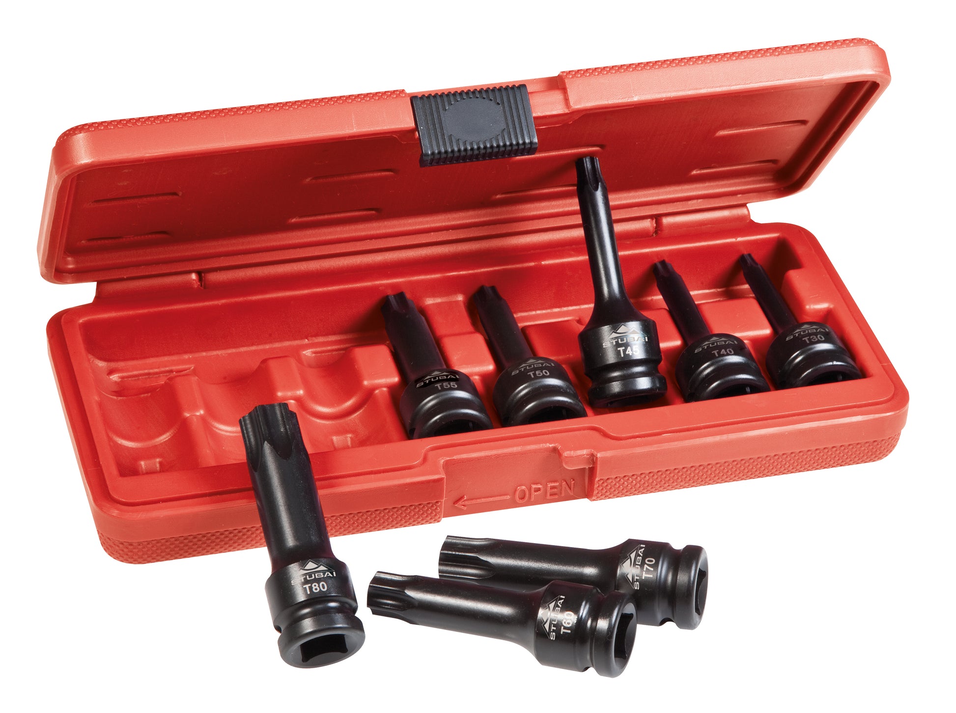 Nr. 2350 STUBAI Krafteinsätze Torx 1/2 DIN 3121 Chrom-Molybdän Stahl schwarz, 8-tlg.in Kunststoffkassette. Bestehend aus: TX30 TX40 TX45 TX50 TX55 TX60 TX70 TX80