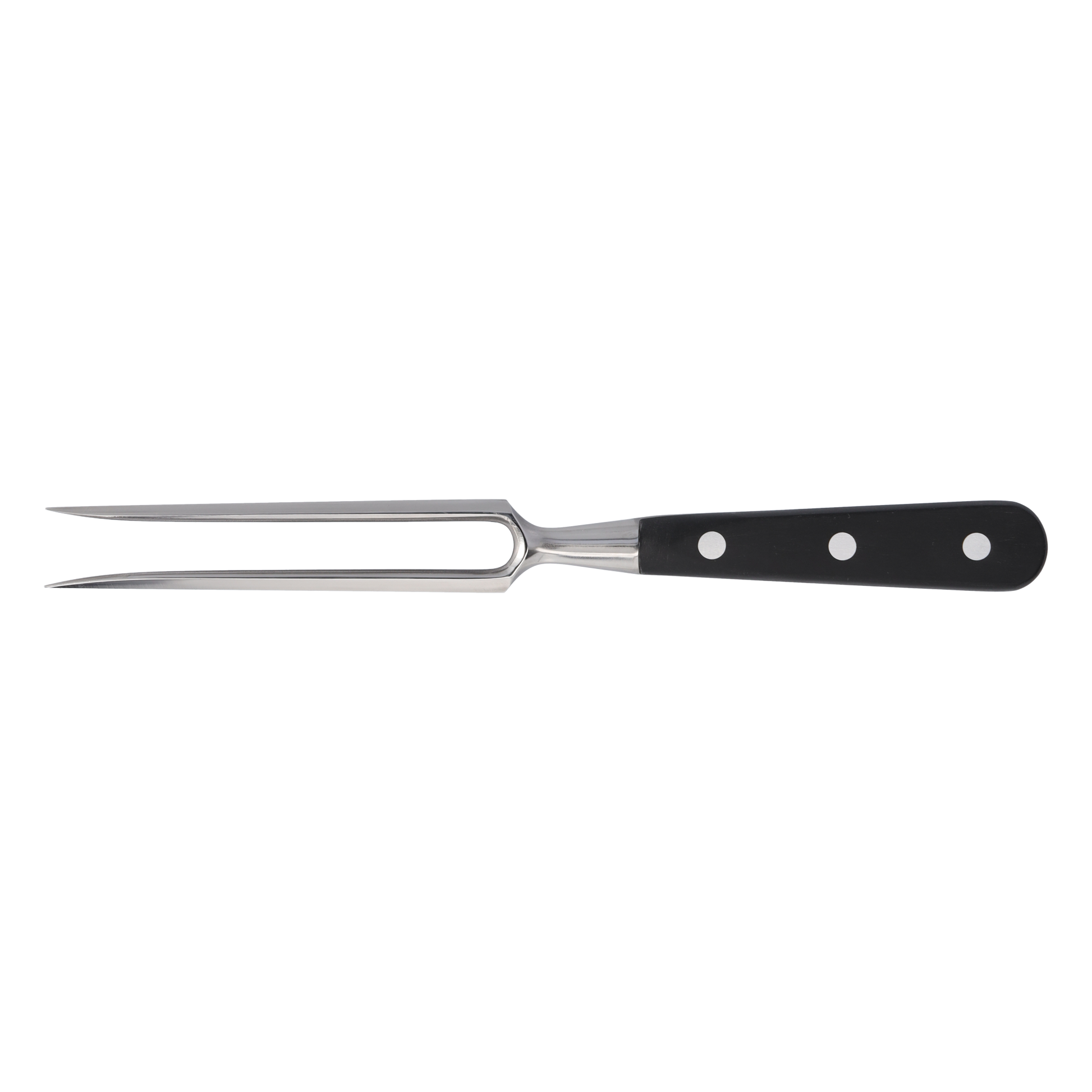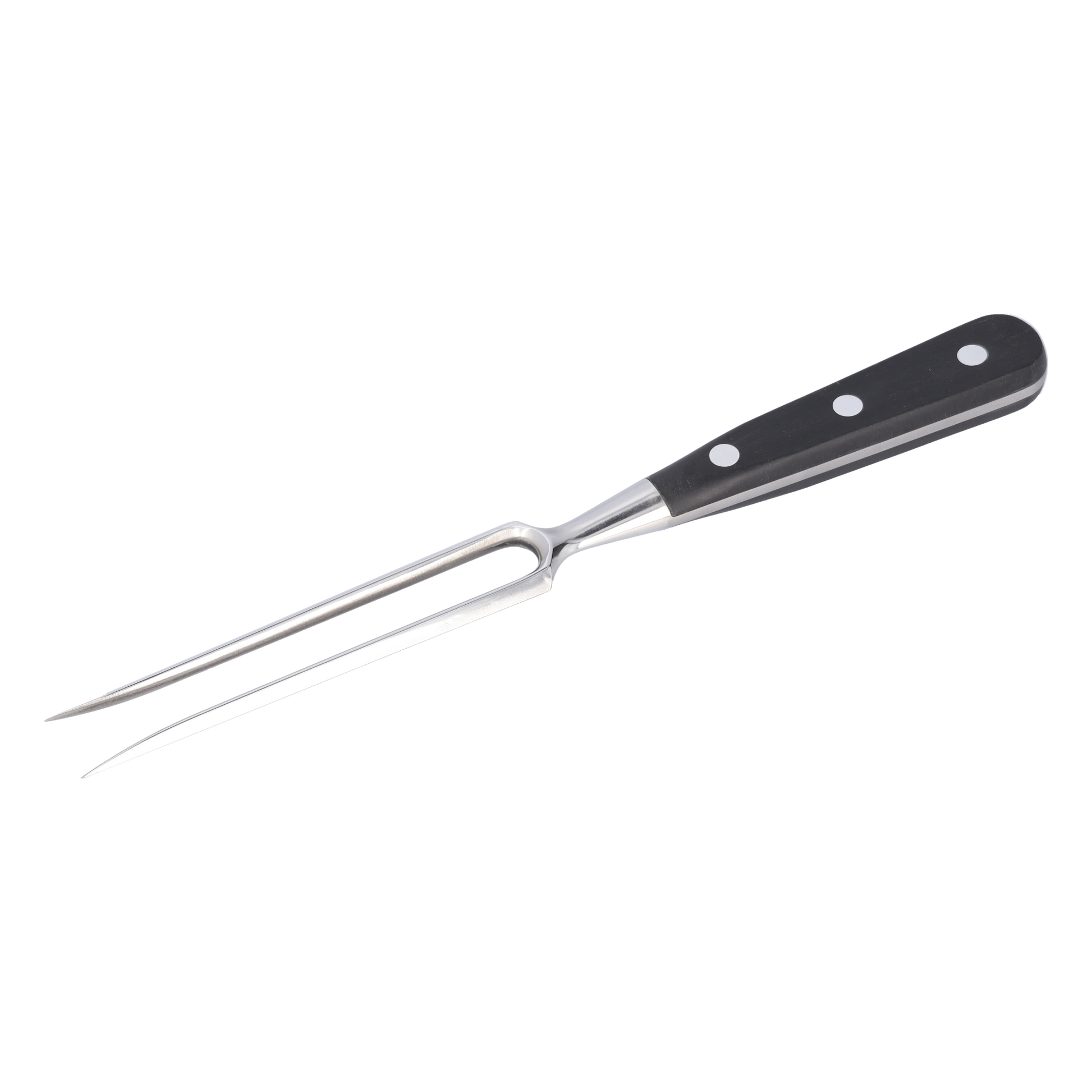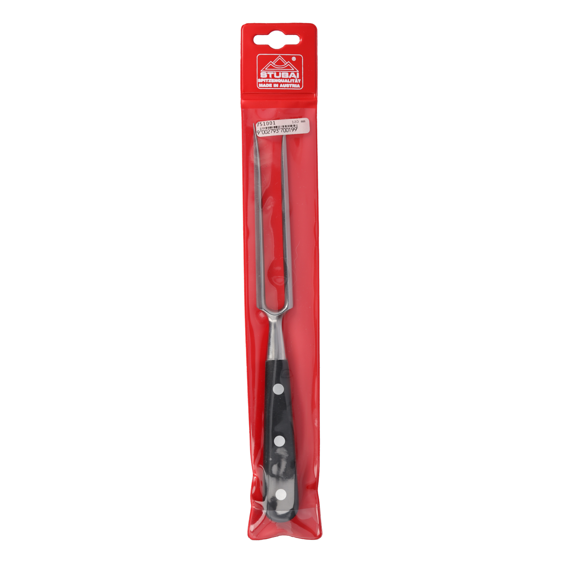 Die STUBAI Tranchiergabel ist ein unverzichtbares Werkzeug für Profiköche und Hobbyküche gleichermaßen. Hergestellt aus hochwertigem, rostfreiem Chrom-Molybdän-Edelstahl bietet diese Gabel eine beeindruckende Härte von 55 HRC. Durch die Spezialhärtung wird eine maximale Stabilität und Langlebigkeit gewährleistet, wodurch sich anspruchsvolle Aufgaben auch langfristig mühelos erledigen lassen. Die Gabel ermöglicht ein leichtes Durchdringen von Geflügel, Gemüse, Fisch und Fleisch sowie anderen Lebensmitteln. Der ergonomische POM-Schutzgriff sorgt selbst bei längeren Einsatzzeiten für einen rutschsicheren Halt und für eine komfortable Handhabung. Der Griff ist spülmaschinenfest, speziell vernietet und verfügt über eine fugendichte Verschweißung mit der Klinge. Mit diesen Eigenschaften entspricht die Tranchiergabel den höchsten Standards für Lebensmittelsicherheit und Hygiene. Egal, ob Sie ein professioneller Koch sind oder einfach gerne in der Küche experimentieren, die STUBAI Küchengabel wird Ihr zuverlässiger Begleiter sein. Durch ihr hochwertiges Material wird sie zu einer perfekten Ergänzung in einer vollständigen Küchenausstattung. Entdecken Sie jetzt die Präzision und Qualität der STUBAI Tranchiergabel und erleben Sie das Vergnügen des Kochens auf einem neuen Niveau!