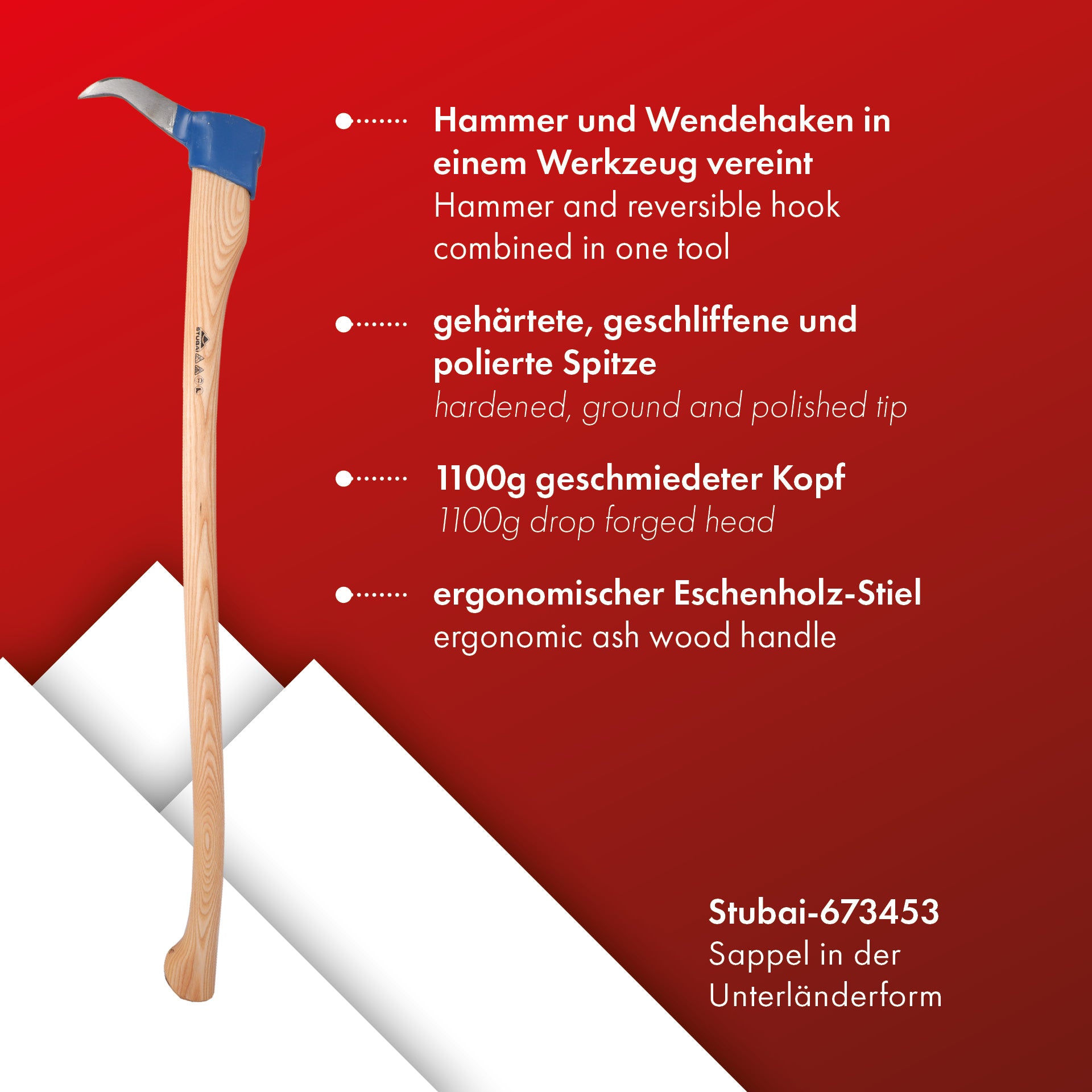 STUBAI Sappie Unterländer-Form | 1100 g Kopfgewicht | Sappel mit Eschenholz-Stiel | gesenkgeschmiedet, Spitze gehärtet, geschliffen, poliert | zum Ziehen und Bewegen von Holzstücken