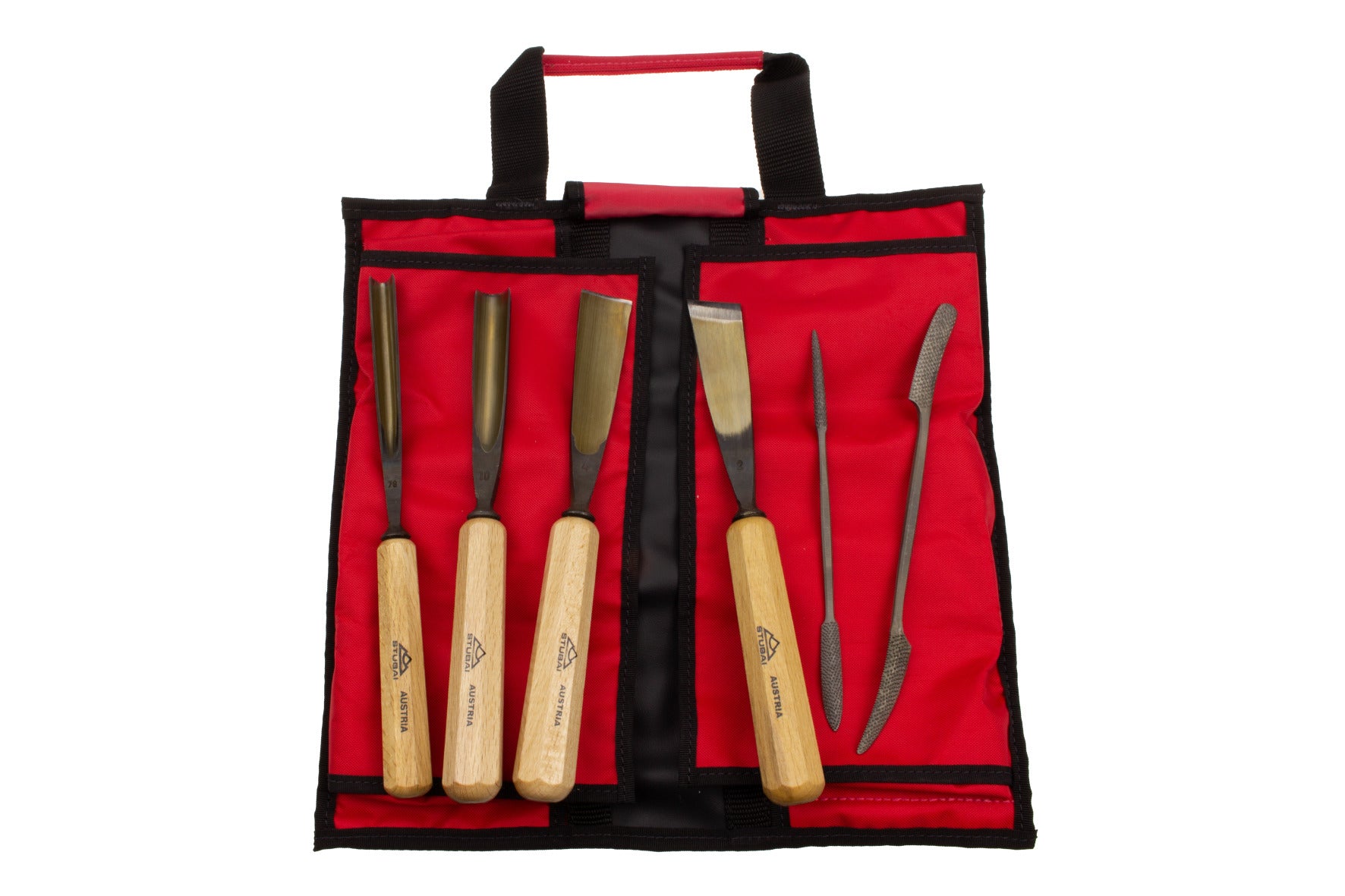 - ARTIKELNUMMER S520005 – 6-TEILIGES SCHNITZEISEN- & RIFFELRASPEL-SET Von Bildhauern zusammengestellt, ideal für mittelgroße Arbeiten. Enthalten: Gaißfuß 527910, Hohleisen 521016, Flacheisen 520425, Balleisen 520225, Riffelraspeln 538514 & 538517.