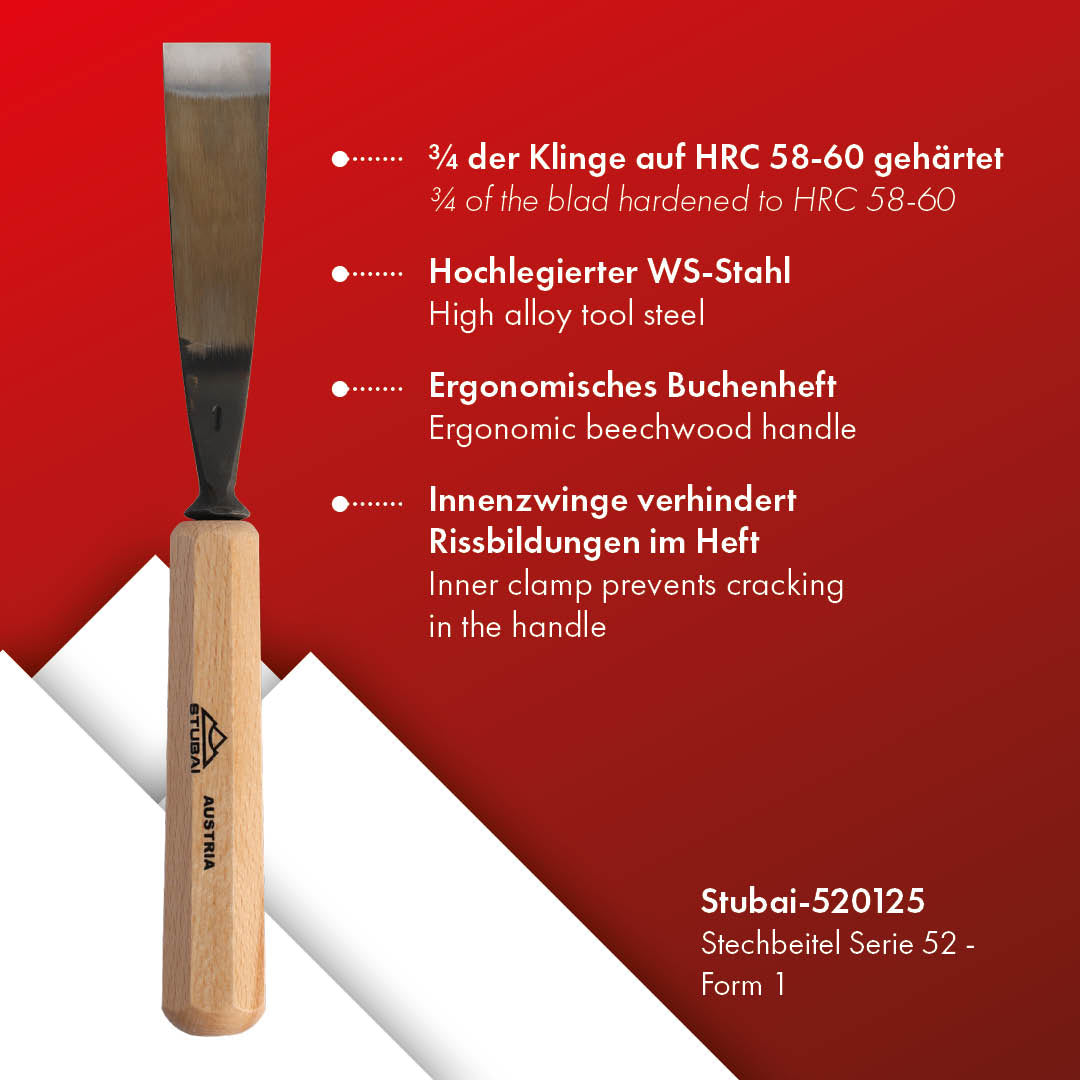 STUBAI Stemmeisen Stechbeitel Serie 52 - Form 1 | Gerades Balleisen 25 mm, mit Holzgriff, für glatte Flächen, zum Vorstechen, Kerb- und Reliefschnitzarbeiten, zur Bearbeitung von Holz