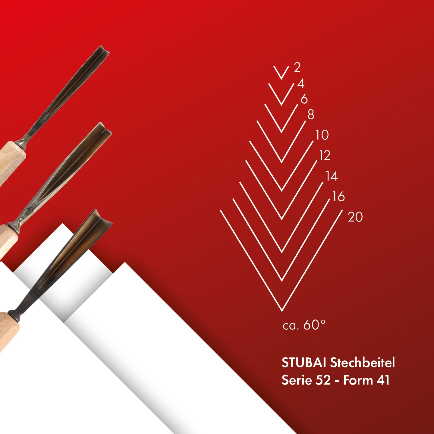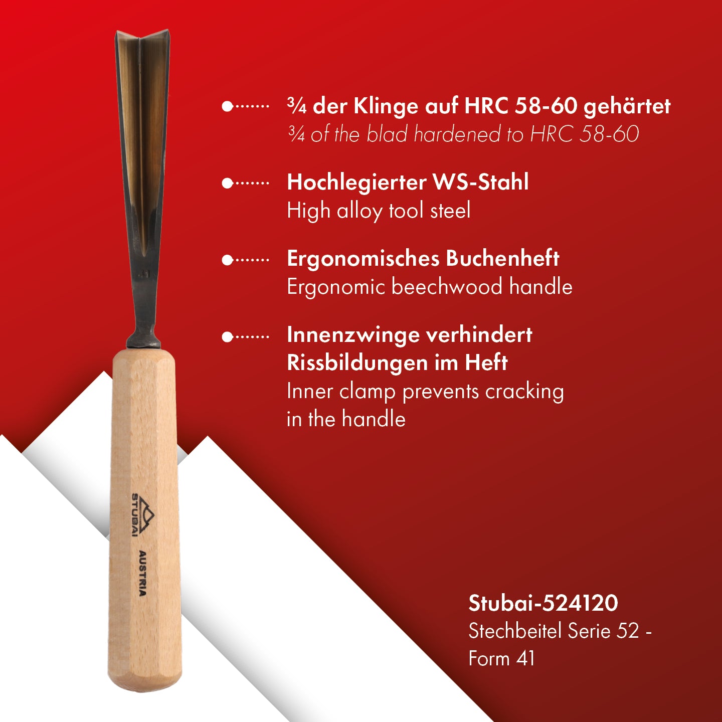 STUBAI Stemmeisen Stechbeitel Serie 52 - Form 41 | Gerader Gaißfuß 20 mm, mit Holzgriff, für Kerb- und Reliefschnitzarbeiten, Figurenarbeiten, Profilleisten, zur präzisen Bearbeitung von Holz