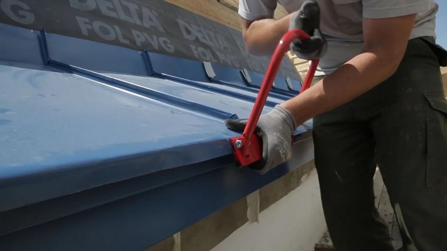Die Konstruktion des Traufenkanters ermöglicht Kantungen von über 90° und sorgt damit für ein Höchstmaß an Flexibilität auch bei komplexeren Formen und Übergängen. Dank der breiten Öffnung ist es außerdem möglich, einen bereits umgelegten Doppelstehfalz präzise mit abzukanten. Damit deckt dieses Werkzeug eine Vielzahl an Arbeitssituationen ab, die mit herkömmlichen Methoden nur schwer oder zeitaufwendig zu bewältigen wären.