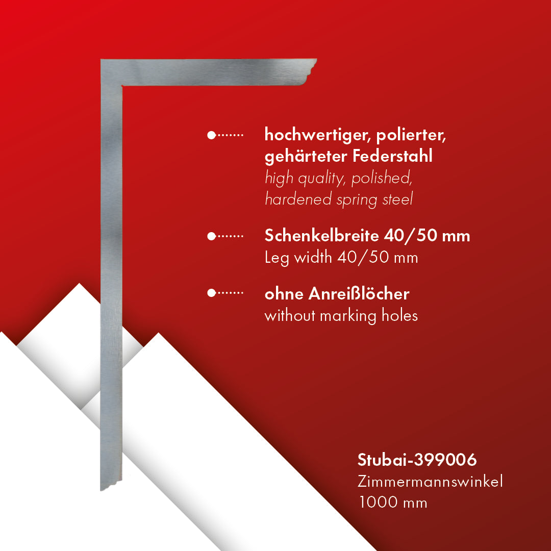 STUBAI Zimmermannswinkel 1000 mm | geschweißt, ohne Anreißlöcher | Profi Schreinerwinkel für präzise Messungen und Markierungen, Federstahl Maßwinkel